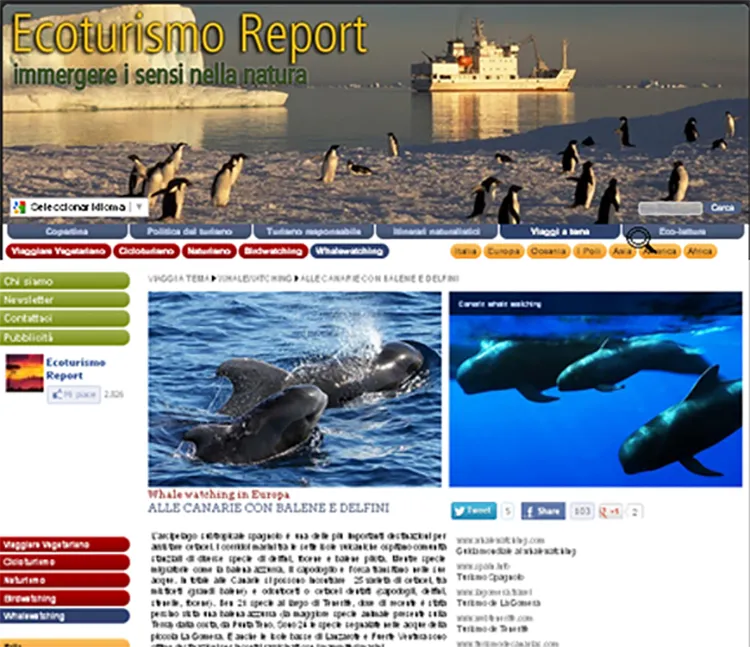 En la edición digital del magazine italiano ‘Ecoturismo Report.com’ se ha publicado hace unos días un artículo dedicado al avistamiento de ballenas y delfines en las islas de Tenerife y La Gomera, en el que se describe con gran acierto las posibilidades para realizar uno de esos avistamientos de cetáceos poniendo el acento en la belleza del encuentro con estos mamíferos marinos en las costas tinerfeñas y gomeras y en las muchas posibilidades y ofertas que existen para realizarlos, a través de diversas empresas y embarcaciones. ‘Ecoturismo Report.com’ es uno de los mejores portales de viajes italianos, especializado en turismo de la naturaleza, ecológico y de aventura.