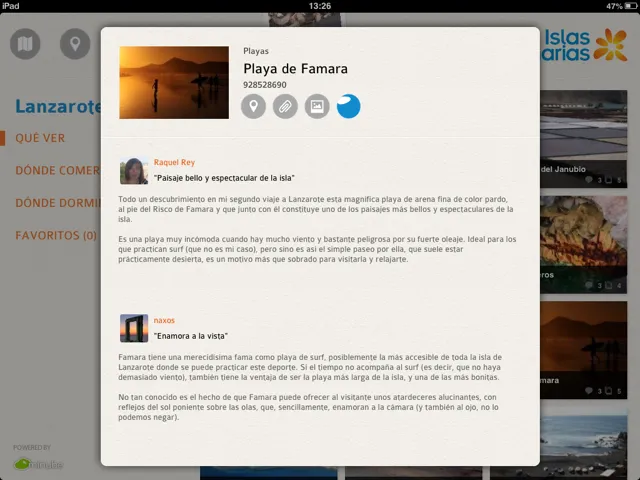 Las guías en forma de apps son una de las herramientas más utilizadas por el nuevo viajero para elegir y conocer su próximo lugar de vacaciones o escapada. Turismo de Canarias, consciente de ello y en su apuesta por el marketing de contenidos, descubre en esta guía más de 160 rincones para los potenciales visitantes de las Islas Canarias, con más de 400 imágenes e información completa para conocerlos mejor, contactar y geolocalizarlos en un mapa integrado. Y por supuesto, con las experiencias reales de numerosos viajeros que estuvieron allí y que tratan de inspirar a otras personas en la búsqueda de su destino.